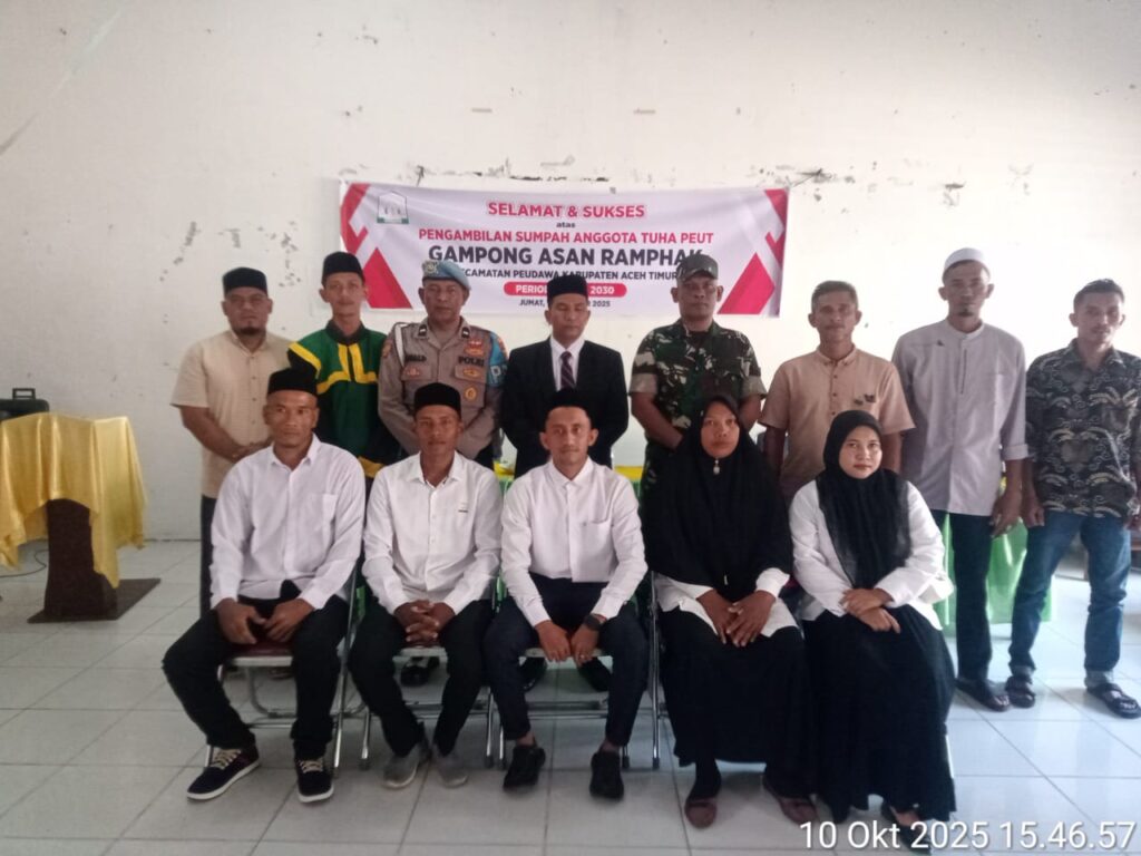 Metropesawat.com,ACEH TIMUR – Adnan, S.Ag, Camat Peudawa, Kabupaten Aceh Timur, secara resmi melantik dan mengambil sumpah anggota Tuha Peut Gampong Asan Ramphak di aula kantor camat pada Jumat (10/10/2025).