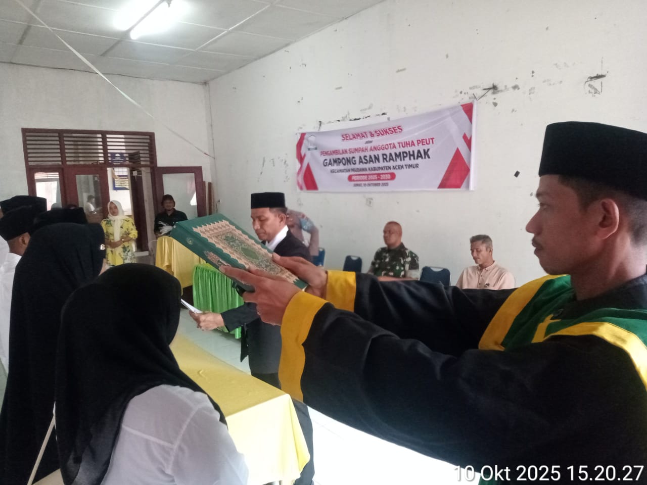 Metropesawat.com,ACEH TIMUR – Adnan, S.Ag, Camat Peudawa, Kabupaten Aceh Timur, secara resmi melantik dan mengambil sumpah anggota Tuha Peut Gampong Asan Ramphak di aula kantor camat pada Jumat (10/10/2025).