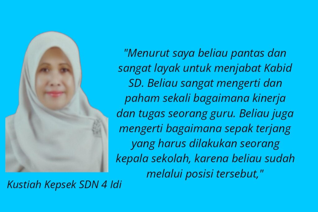 “Menurut saya beliau pantas dan sangat layak untuk menjabat Kabid SD. Beliau sangat mengerti dan paham sekali bagaimana kinerja dan tugas seorang guru. Beliau juga mengerti bagaimana sepak terjang yang harus dilakukan seorang kepala sekolah, karena beliau sudah melalui posisi tersebut,” cetusnya.