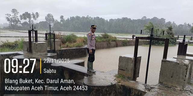metropesawat.com, ACEH TIMUR – Memasuki musim penghujan, Kapolsek Darul Aman, Polres Aceh Timur, Polda Aceh, Iptu Syamsul Bahri, S.H. melakukan patroli wilayah serta mengecek debit air bendungan irigasi di Gampong Blang Buket, Kecamatan Darul Aman, Kabupaten Aceh Timur, Sabtu, (22/11/2025).