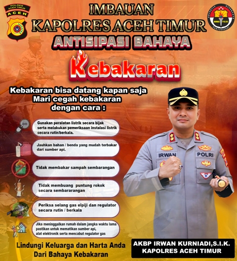 ‘’Pastikan tidak ada sumber api yang masih menyala saat akan pergi meninggalkan rumah,’’ jelas Kapolres Aceh Timur AKBP Irwan kurniadi, S.I.K. (Iwan Gunawan).