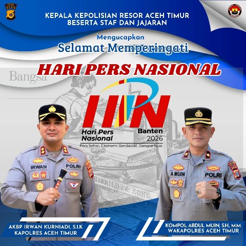 “Atas nama pimpinan dan seluruh anggota Polres Aceh Timur dan jajaran, saya mengucapkan Selamat Hari Pers Nasional 2026. Kami juga sangat mengharapkan masukan, kritik yang membangun, serta peran aktif insan pers dan tokoh masyarakat, agar Polri semakin mantap dalam meningkatkan kinerja dan pelayanan kepada masyarakat,” ujar AKBP Irwan Kurniadi, S.I.K. Senin, (09/02/2026).