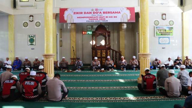 metropesawat.com, ACEH TIMUR – Dalam menyambut memperingati Hari Ulang Tahun (HUT) ke-80 Kemerdekaan Republik Indonesia, Polres Aceh Timur, Polda Aceh menggelar kegiatan Dzikir dan Do’a di Masjid Babuttaqwa Polres Aceh Timur, pada Kamis, (14/08/2025) pagi.