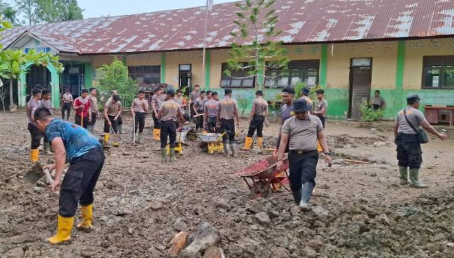 metropesawat.com, ACEH TIMUR – Sebagai bentuk kepedulian terhadap dunia pendidikan pascabencana hidrometeorologi , Polres Aceh Timur bersama personel BKO Brimob dri Resimen I Kedung Halang, Bogor melaksanakan gotong royong dengan membersihkan MIN 15 Aceh Timur di Gampong Buket Bata, Kecamatan Pante Bidari yang terdampak banjir beberapa waktu lalu.